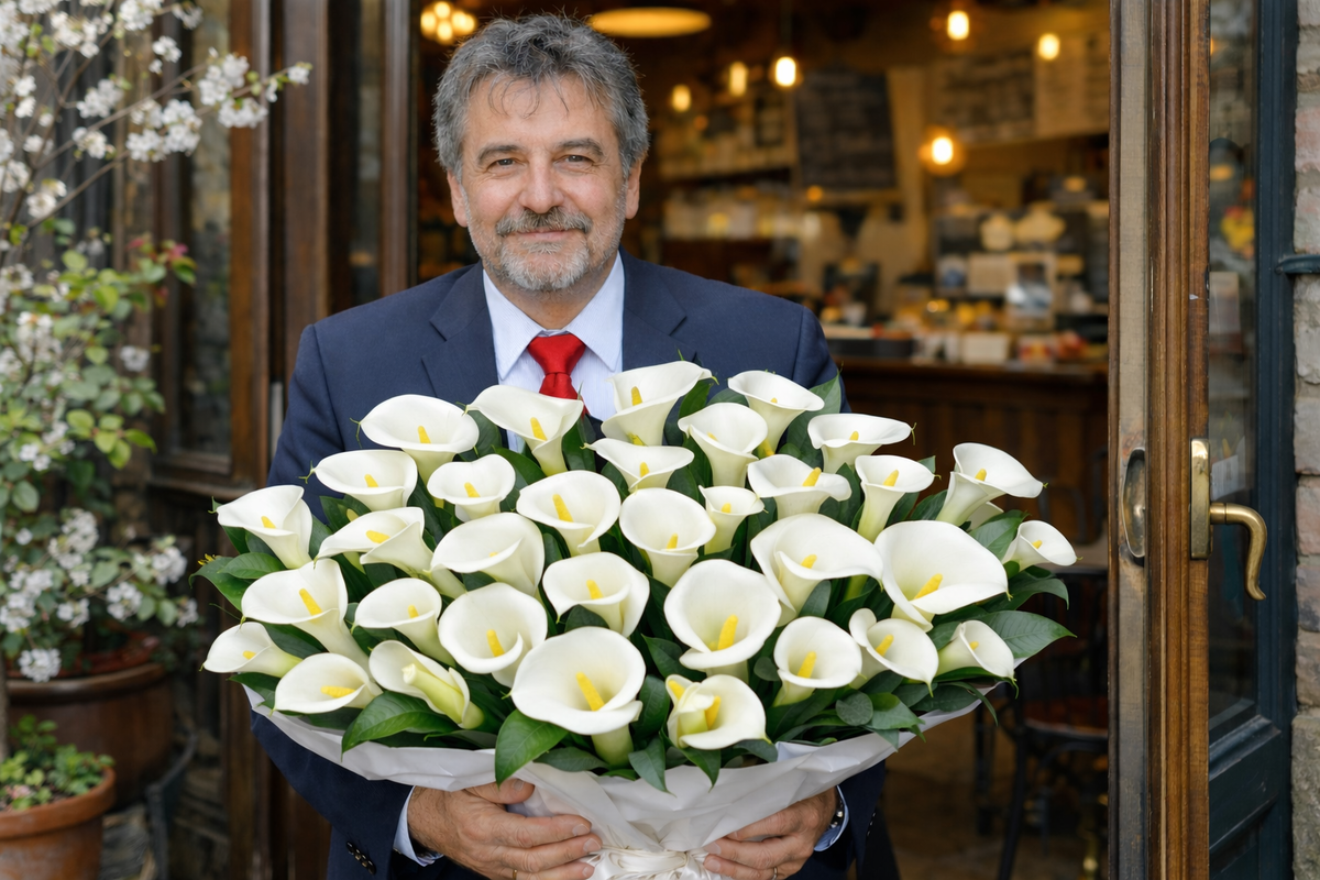 Сергей Павлович вошёл — в пиджаке, галстук чуть набок, волосы причёсаны, но как-то второпях, будто в машине. В руке — букет. Тюльпаны, красные, штук десять.