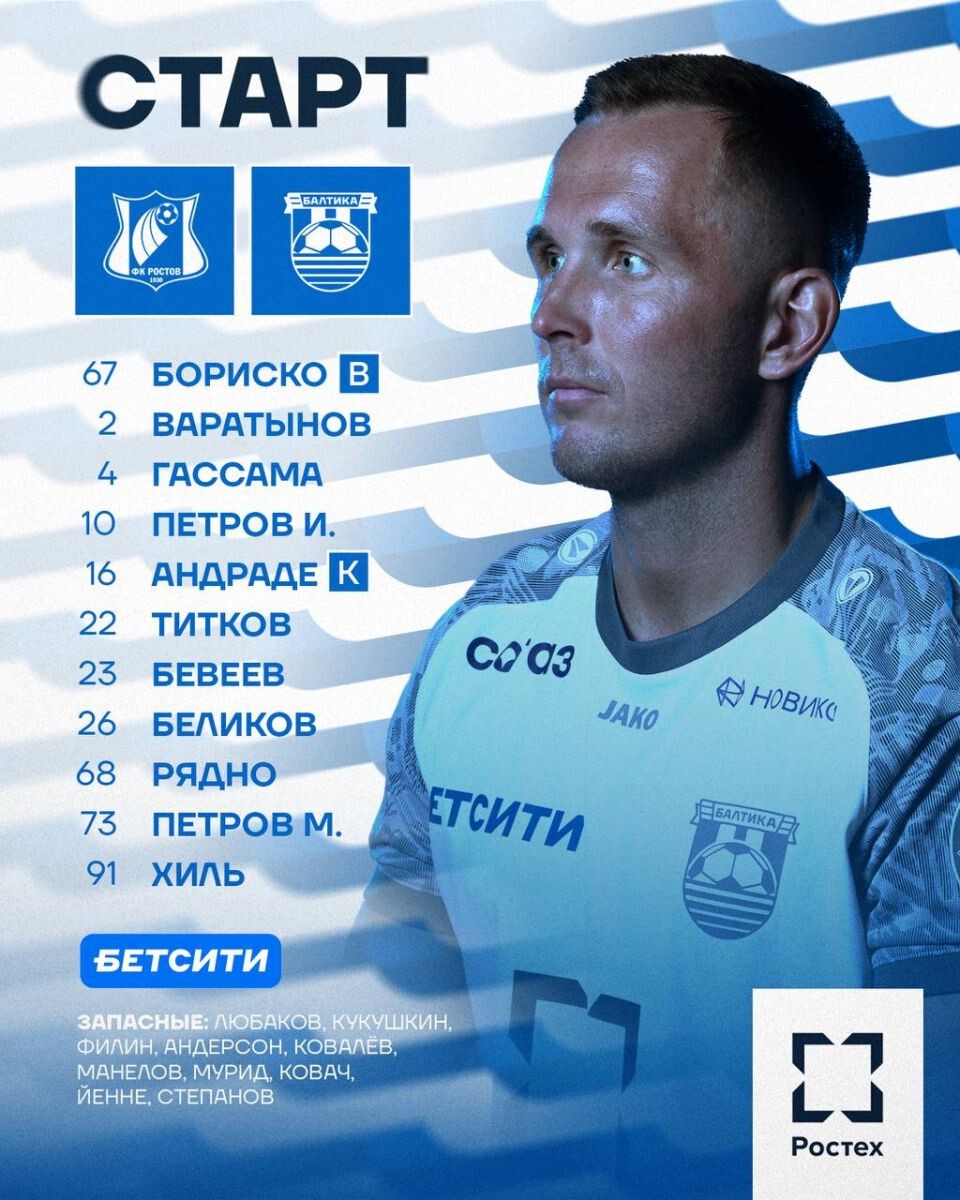 Стартовал матч 20-го тура Российской Премьер-Лиги, в котором на «Ростов Арене» встречаются местный «Ростов» и калининградская «Балтика». Стартовые составы команд выглядят следующим образом. ФК «Балтика»: Бориско, Варатынов, Гассама, Петров, Андраде, Титков, Бевеев, Беликов, Рядно, Петров М., Хиль. ФК «Ростов»: Ятимов, Сако, Мелехин, Семенчук, Игнатов, Миронов, Мохеби, Комаров, Роналдо, Голенков, Сулейманов. Обслуживает матч бригада арбитров во главе с Василием Казарцевым. Помогают ему ассистенты Дмитрий Мосякин и Адлан Хатуев, резервный судья Ярослав Хромей. За систему видеопомощи арбитрам (VAR) отвечает Иван Абросимов, ассистент VAR — Павел Шадыханов. Прямая трансляция игры доступна по ссылке 0+
