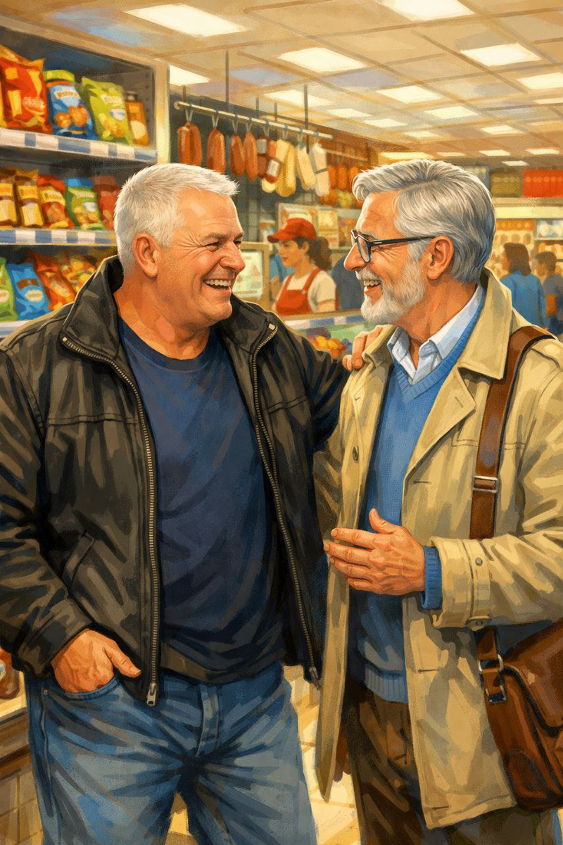 Мы стояли в очереди у кассы супермаркета на Первомайской. Вокруг гудела суббота — тележки, дети, кто-то требовал пробить цену на сметану. А мы стояли и смотрели друг на друга — два мужика под шестьдесят, которые когда-то были лучшими друзьями на свете.