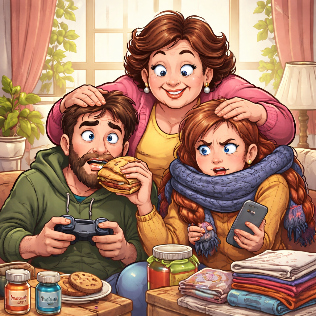 Любая жалоба на здоровье (или даже её отсутствие) становится поводом для тотального контроля и действий. Мать записывает взрослого ребенка к «своим» врачам, присутствует на приемах, отвечает за него на вопросы, покупает лекарства, которые, по её мнению, нужны, и контролирует их прием. Любое недомогание раздувается до масштабов катастрофы, чтобы подтвердить тезис: «Ты без меня не выживешь, ты постоянно болеешь».