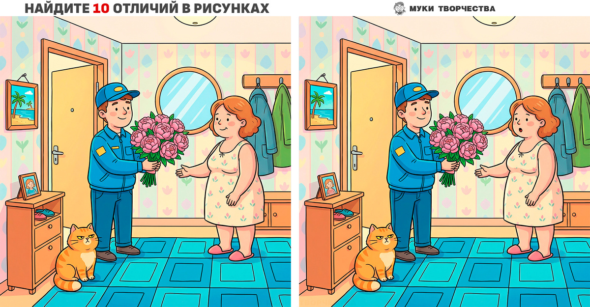 Друзья, сегодня тест на внимательность. Перед вами два похожих рисунка, в которых художник сделал 10-ть отличий. Найдите, чем отличаются рисунки с женщиной, которой курьер вручает букет пионов. Для этого отложите свои дела на пару минут и внимательно рассмотрите картинки. Это полезное упражнение для ума, а не просто развлечение. Оно помогает сохранить концентрацию внимания и память. В конце статьи я оставлю подсказку-ответ, с которой вы можете сверить свои результаты или получить помощь, если зайдёте в тупик. Комментарии и лайки помогают в развитии канала, поддержите автора, если понравился материал. Горизонтальная версия: С 8 марта Вертикальная версия: С 8 марта Тут Ещё Больше Задачек: ПОДСКАЗКА-ОТВЕТ: