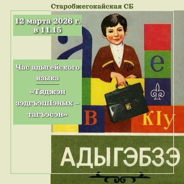 Час адыгейского языка «Тяджэн зэдгъэшIэных – тагъэсэн» Приглашаем вас на Час адыгейского языка «Тяджэн зэдгъэшIэных – тагъэсэн», который пройдет 📆 12 марта 2026 года с 🕔 11:15 до 12:00 в 📍Старобжегокайской сельской библиотеке. В увлекательной форме библиотекарь познакомит детей с выдающимися адыгейскими просветителями и писателями. Ребята смогут проверить свои знания в игре-викторине, разгадать загадки, произносить скороговорки и решать задачки на адыгейском языке. Завершится мероприятие просмотром мультфильма на адыгейском языке. 🎉Ждем всех!🎉