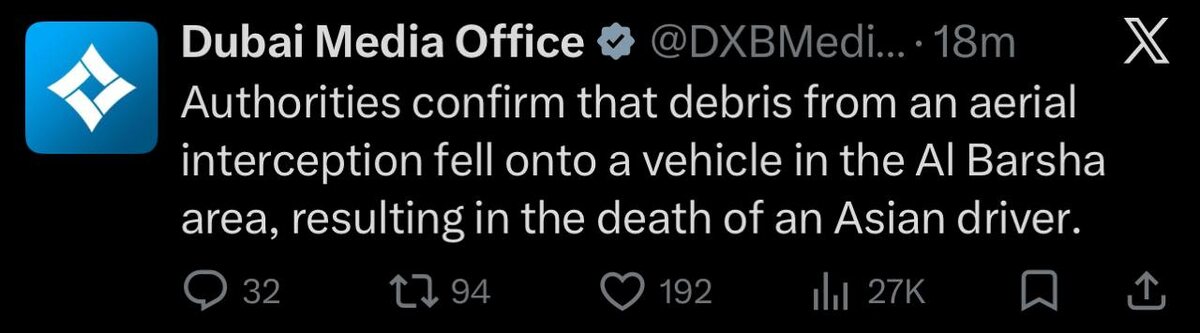 Asian driver struck and killed by interception debris in Dubai — UAE