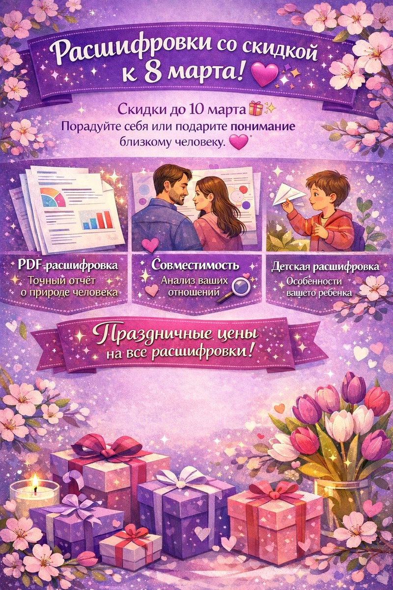 💜🎉 8 марта — повод позаботиться о себе. Или подарить понимание тому, кто рядом. 💖 PDF-расшифровка — точный отчёт о природе человека: сильные стороны, скрытый потенциал и как это применять в жизни. 📄✨ Расшифровка совместимости покажет механику ваших отношений: что вас сближает и откуда берутся конфликты. 💑🔍 Детская расшифровка — для тех, кто хочет точно знать особенности своего ребёнка и какие качества развивать с ранних лет. 👶🌱 Если вы давно хотели получить расшифровку карты — сейчас идеальный момент. Это подарок, который будет полезен годами. 🎁⏳ До 10 марта действуют праздничные цены на всю продукцию. 🎈🛍️ https://human-design.space/category/platnye-rasshifrovki/