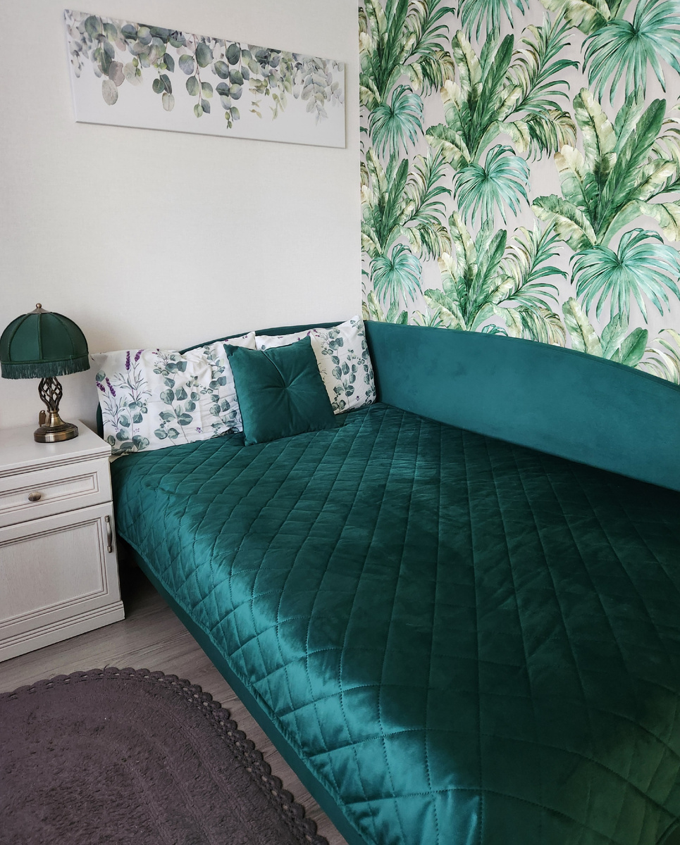 Недавно я купила новое покрывало, и оно подошло просто идеально. Красивое стёганое покрывало глубокого изумрудного цвета очень гармонично вписалось в мой интерьер. Внешняя сторона выполнена из объёмного велюра с роскошным переливом, внутренняя - из матовой ткани-компаньона цвета экрю. Есть тонкий наполнитель синтепон. Покрывало лёгкое, и теперь, наконец, удобно заправлять постель, к тому же, оно без труда помещается в стиральную машину.