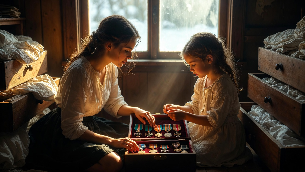 Зима в тот год выдалась снежная. Морозы стояли такие, что из дома лишний раз не хотелось выходить. Лизе это даже нравилось – можно было сидеть в уютной гостиной, пить горячий чай с бабушкиным вареньем и слушать мамины рассказы о прошлом. Но в этот раз всё началось не с рассказов, а с уборки. Вера решила разобрать старый комод в спальне – тот самый, что стоял там с незапамятных времён и был забит всякой всячиной. Лиза, конечно, увязалась помогать. Ящик за ящиком они перебирали вещи: старые простыни, вышитые рушники, какие-то пожелтевшие кружева. И вдруг в самом нижнем ящике, под грудой тряпья, Лиза нащупала что-то твёрдое. – Мама, тут что-то есть! – закричала она. Вместе они извлекли на свет тяжёлую деревянную шкатулку, окованную потемневшей медью. Такая же, как те, в которых хранили письма, только больше. – Открывай, – сказала Вера, чувствуя, как колотится сердце. Лиза осторожно подняла крышку. Внутри, на бархатной подушечке, лежали медали. Старые, с выцветшими лентами, но настоящие. О