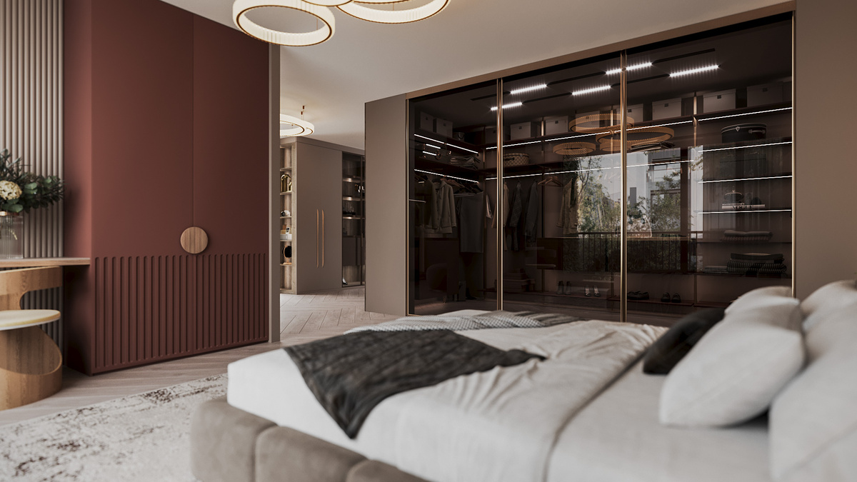 Современная спальня — это пространство, где каждая деталь работает на комфорт и функциональность. В этом обзоре разбираем проект, в котором использованы актуальные решения для хранения и зонирования. Главная особенность проекта — подвесная каскадная система раздвижных дверей, которая отделяет гардеробную от основной спальни. Крепление осуществляется к потолочному треку, поэтому нижний трек отсутствует — пол остаётся целым, нет порогов. Механизм работает по телескопическому принципу: одна дверь тянет за собой остальные, что экономит пространство. В систему встроены доводчики для плавного и бесшумного закрывания. Профиль выполнен в цвете латунь — элегантный золотистый оттенок, а заполнение — из тонированного стекла бронза, что добавляет глубины цвета и визуальной легкости. За раздвижными дверями скрывается просторная П-образная гардеробная на основе алюминиевой стеллажной системы. Стойки и профили выполнены из алюминия в цвете латунь — это несущая конструкция премиального уровня. Система