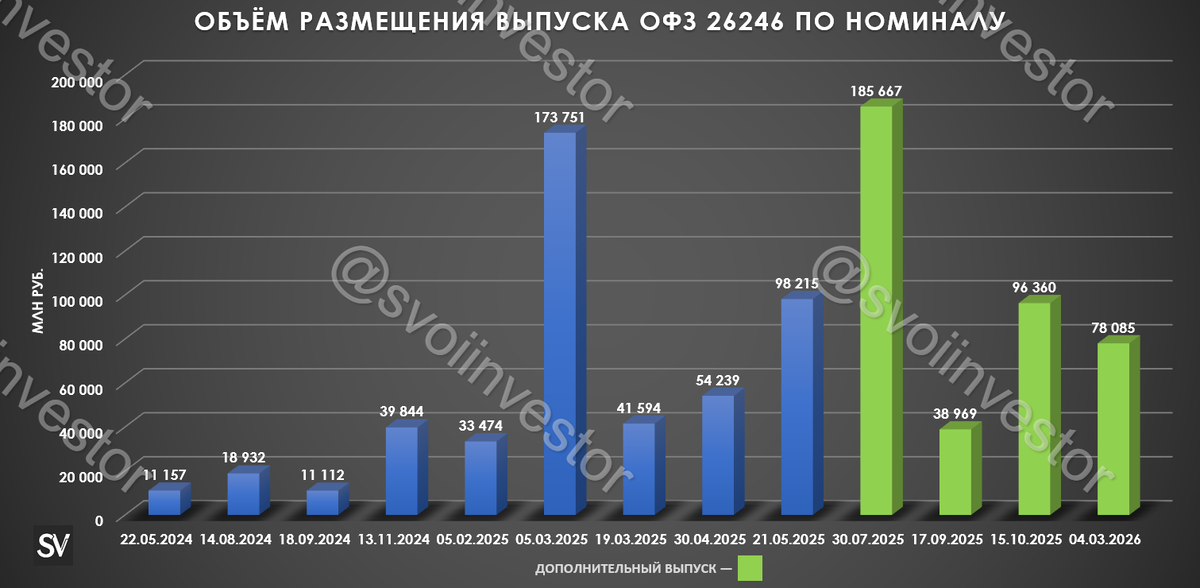 Минфин провёл аукцион ОФЗ, предложив инвесторам два выпуска. При его проведении индекс RGBI находился чуть выше 118 пунктов, с учётом недельных принтов инфляции и ослабления рубля снизился до 117,93 пунктов: 🔔 По данным Росстата, за период с 25 февраля по 2 марта ИПЦ составил 0,08% (прошлые недели — 0,19%, 0,12%), с начала месяца 0,03%, с начала года — 2,22% (годовая — 5,75%). По неделькам за февраль вышло — 0,56%, это гораздо ниже, чем в прошлом году (0,81%), нам остаётся дождаться месячного пересчёта, который преподносит приятные сюрпризы в последнее время. Что же насчёт недельных темпов и марта, то расчёт идёт за 6 дней, показатели гораздо ниже прошлогодних данных (прошлогодние недельки: 2025 г. — 0,15%, 2024 г. — 0,09%). 🔔 В 2026 г. Минфин планирует разместить в ОФЗ 6,5₽ трлн (в иностранной валюте в объёме, эквивалентном не более 1$ млрд, проинфляционный фактор). Такая сумма выглядит довольно оптимистично на фоне курса $ и цены Urals (в 2025 г. разместили более 8₽ трлн). Дефицит