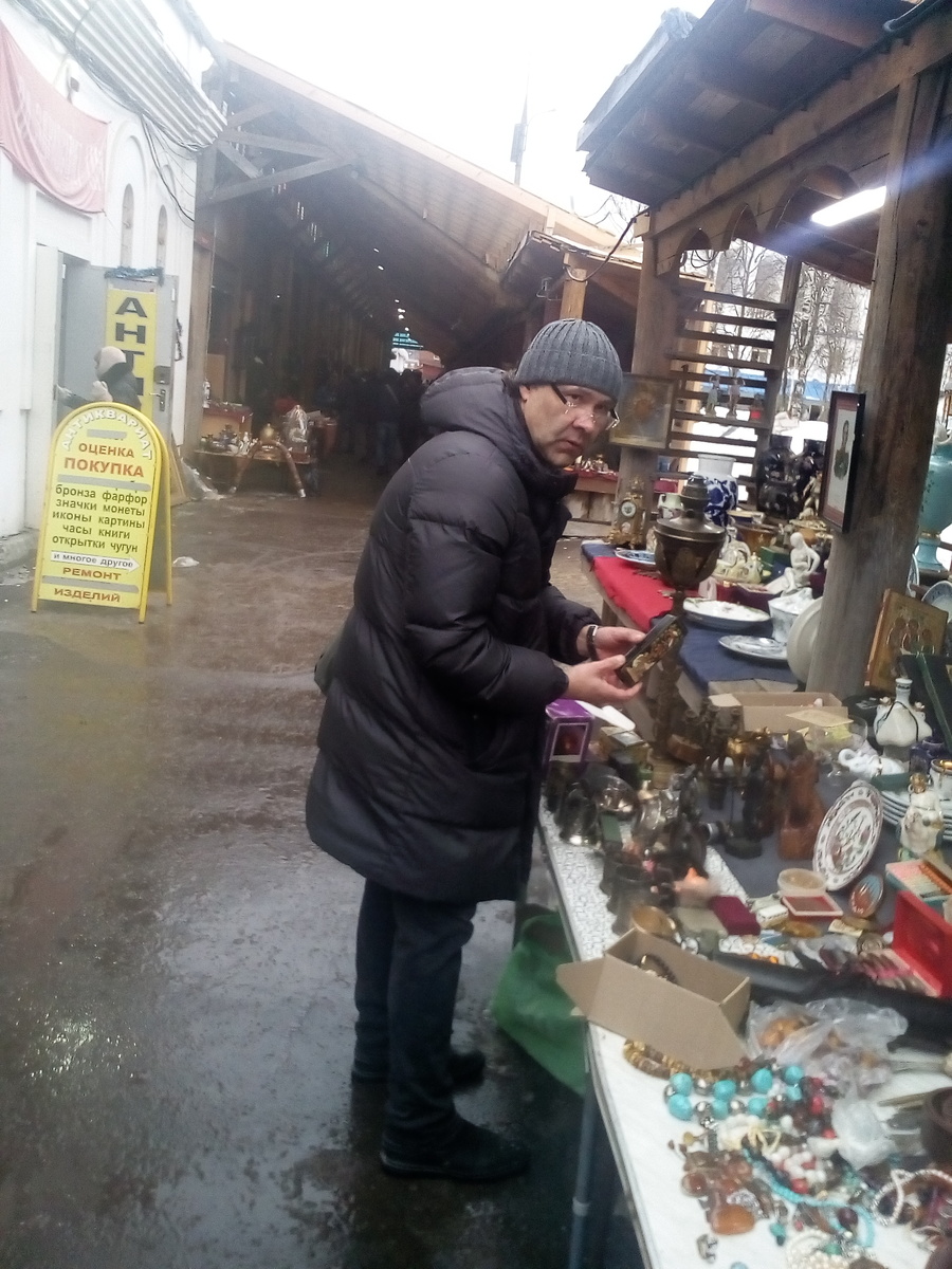 Я знаю три столичных рынка, которые можно назвать блошиными. На ст. ж/д Салтыковко (не люблю). На ст. ж/д Новоподрезвово (люблю порой). На ст. метро "Партизанская" (уважаю). Вот, сегодня ездил на Партизанскую (в Измайлово). 1) Всё дрого... Блокнот настольный с накладкой из мельхиора = просят 2 тр. За авторучку (за которую недавно платил 2 000) - просят ШЕСТЬ! Ну, потому предметы и лежат... Мужик повернулсяю... Кадр испортил... Убрать бы его в фотошопе, да не умею... :0)) Короче, что хорошее и дорогое - стоит ОЧЕНЬ дорого. Так что самые дорогие покупки мои - по 200 рублей. Вот они: Книга и бусы (Дмитров, наваерно)... Надо объяснять - почему купил? Или сами догадаетесь? :0)))) :0) Такие книги в интернете есть... 2) Доволен 3) Продолжение будет