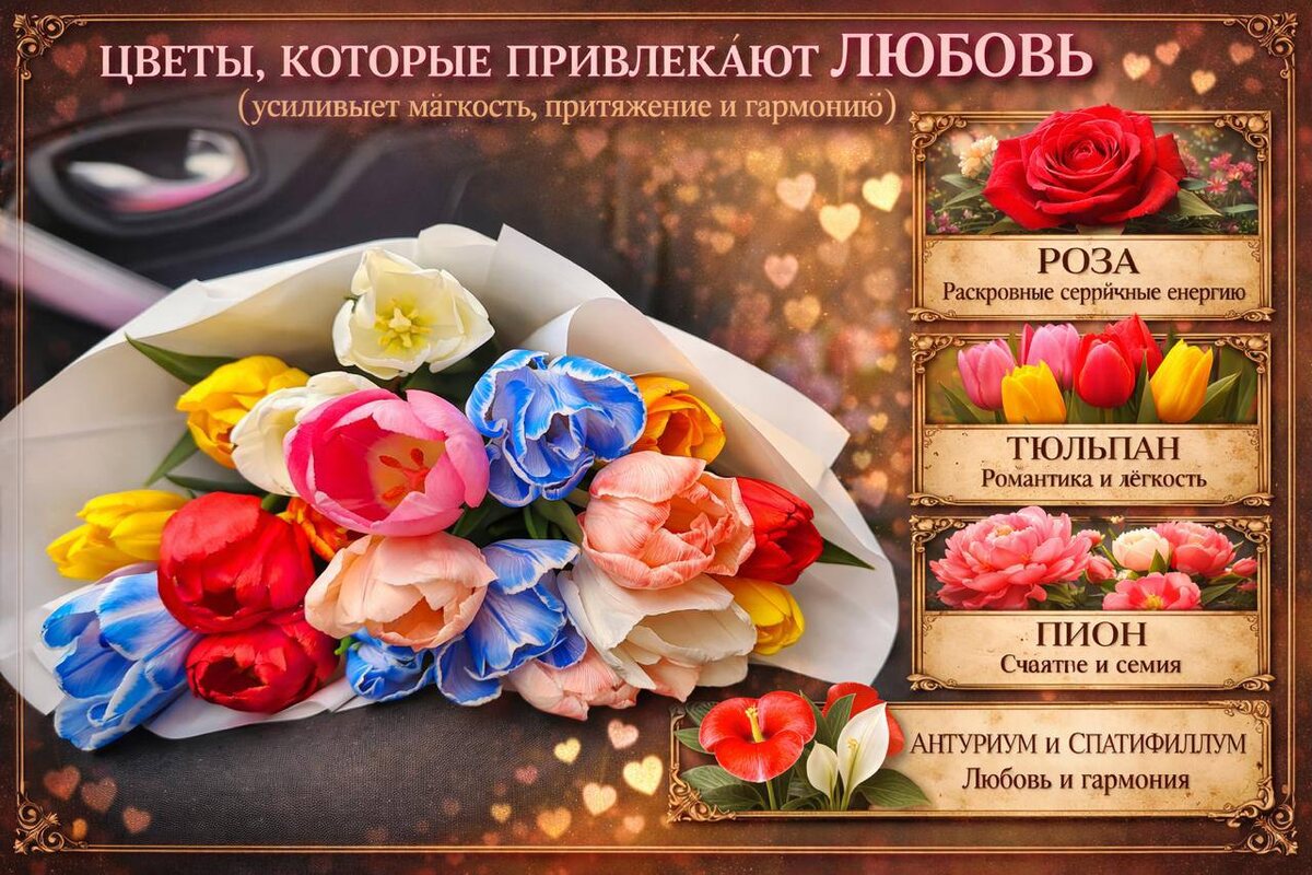 Дарим букеты, выбираем любимые растения, ставим их дома… Но редко задумываемся, почему именно этот цветок нам нравится больше других. В нумерологии и символике природы есть интересное наблюдение: разные цветы усиливают разные энергии — любовь, деньги, удачу, внутреннюю силу. И очень часто человек интуитивно выбирает тот цветок, который помогает усилить именно ту сферу жизни, которая ему сейчас нужна. ЦВЕТЫ, КОТОРЫЕ ПРИВЛЕКАЮТ ЛЮБОВЬ (усиливают мягкость, притяжение и гармонию) 🌹 Роза Самый известный символ любви и притяжения. Помогает раскрывать сердечную энергию и уверенность в себе. 🌷 Тюльпан Связан с романтикой и новыми чувствами. Часто усиливает лёгкость и теплоту в отношениях. 🌼 Пион В восточной культуре считается цветком семейного счастья и брака. Именно поэтому пионы часто ставят в доме, когда хотят привлечь отношения. 🌺 Антуриум (мужское счастье) Популярный комнатный цветок любви и страсти. Считается, что он усиливает притяжение и гармонию между партнёрами. 🌿 Спати