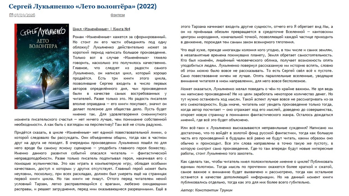 Сергей Лукьяненко «Лето волонтёра» Критика
