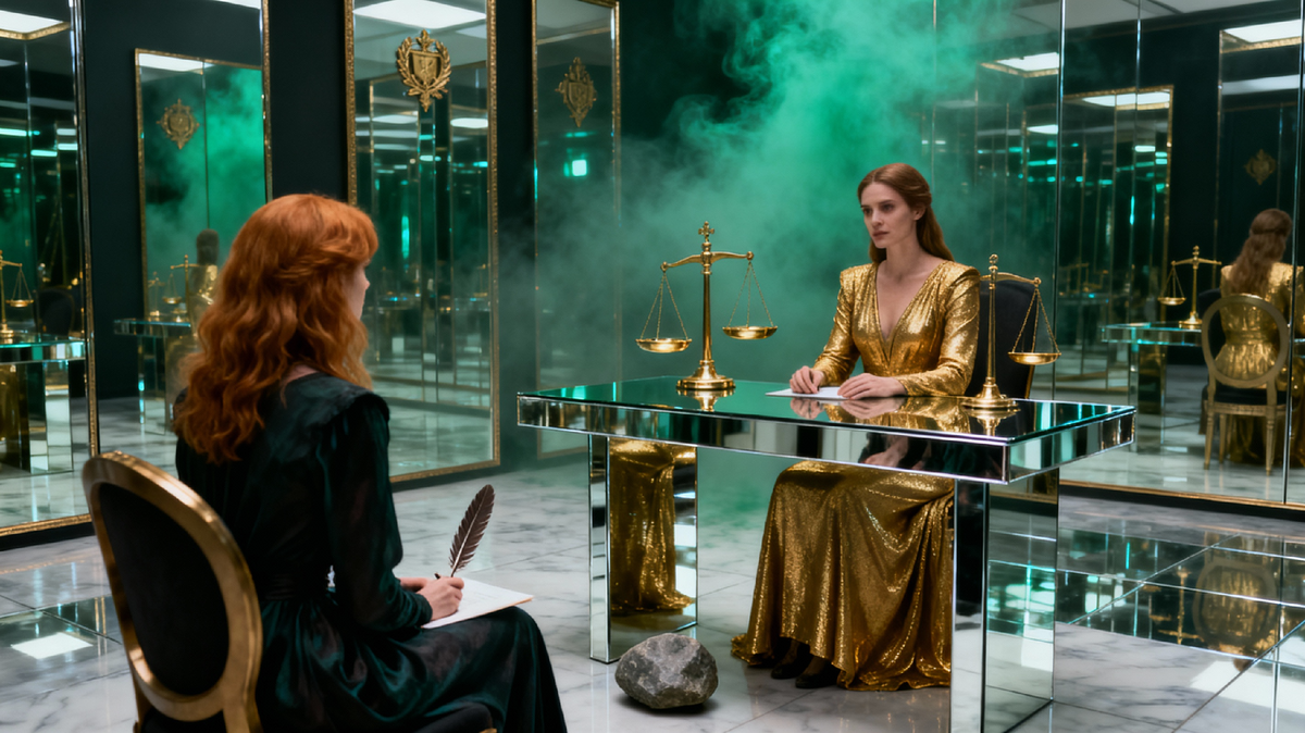 Стены, пол, потолок — всё отражало её бесконечно, словно реальность решила показать каждую грань её личности, даже ту, о которой она давно забыла. Она видела себя со всех сторон: смелую, уставшую, обиженную, дерзкую, тихую, ту, что прячется за улыбкой, и ту, что кричит внутри. Посреди стоял высокий стол, а на нём — весы.