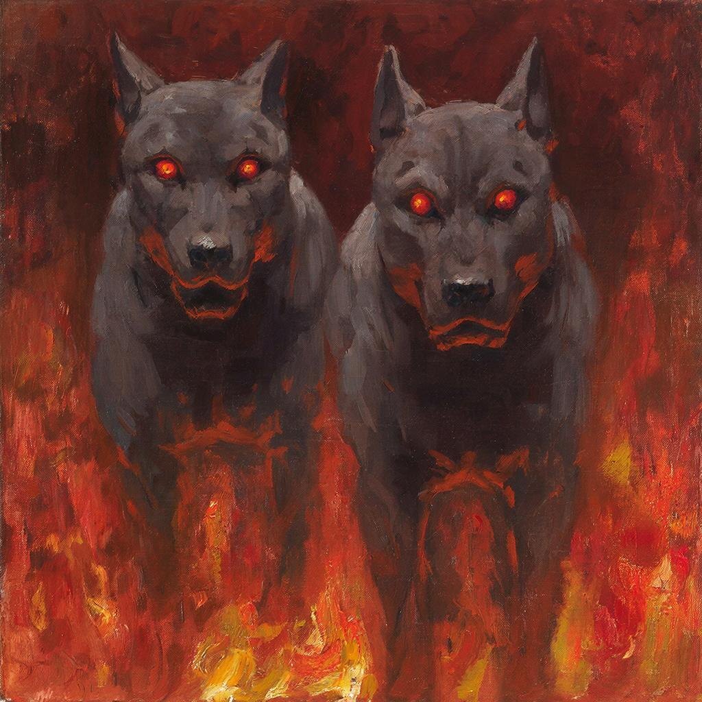 Один пес, тот, что слева, был пепельно-серым. Но внимание приковывал другой. Тот, что справа. Его лапы были массивнее, чернее самой тьмы под кроватью. Он двигался бесшумно, но в каждом его движении чувствовалась пружинистая, звериная мощь.