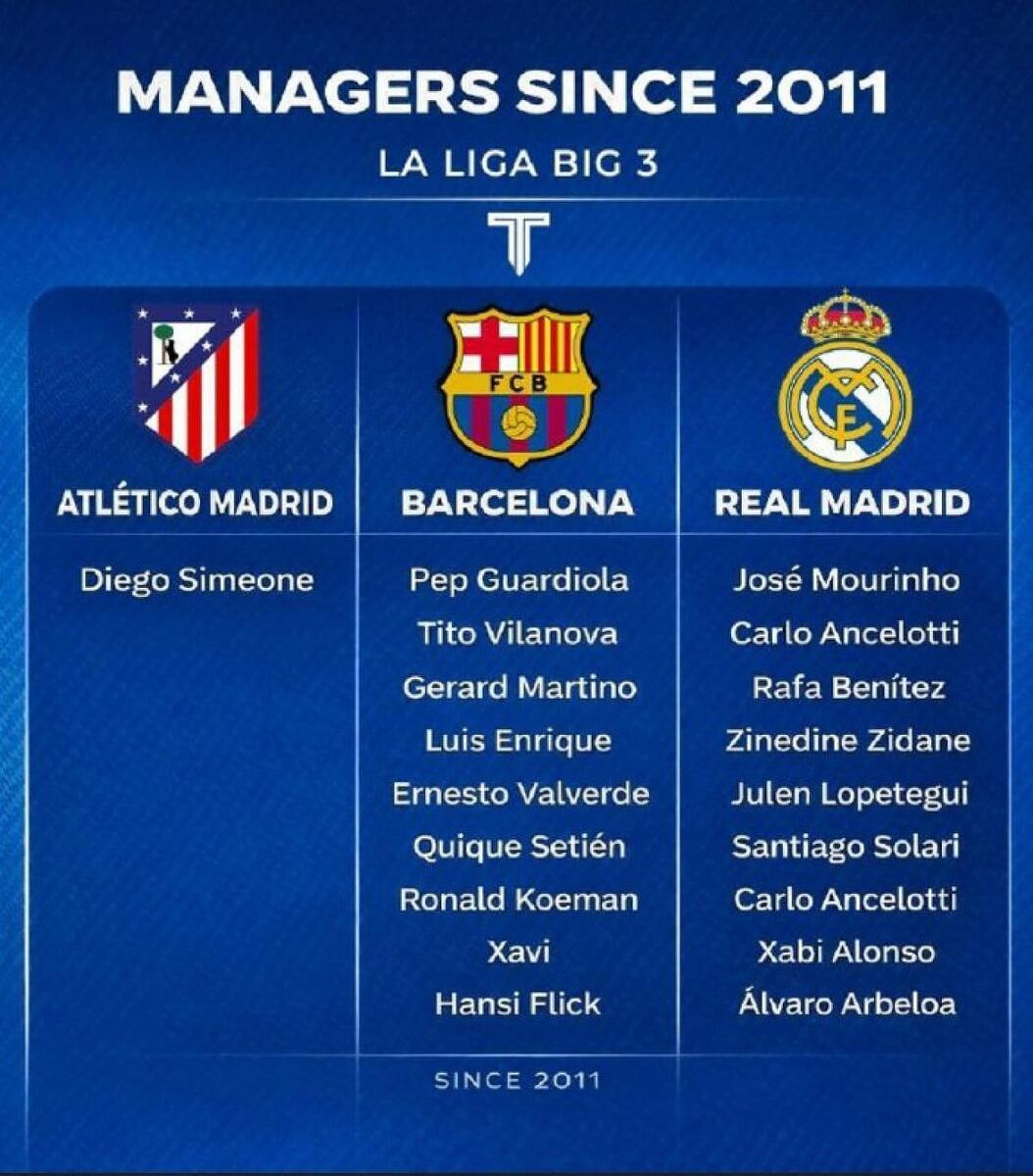 С другой стороны, в «Барселоне» и «Реал Мадрид» смена тренеров происходила гораздо быстрее. «Барселона» с 2011 года работала с девятью тренерами.