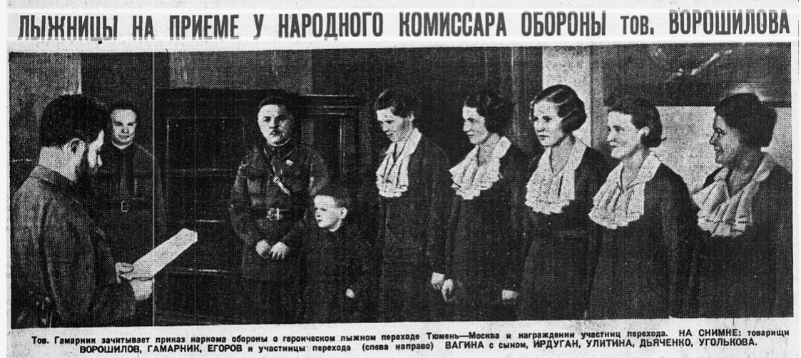 Жены командиров N дивизии тт. Ирдуган Финаида, Уголькова Нина, Вагина Таисия, Дьяченко Клавдия и работница типографии политотдела той же дивизии тов. Улитина Вера, под командой младшего командира тов. Карталова Н. Ф., 22 февраля сего года блестяще завершили лыжный переход Тюмень-Москва.