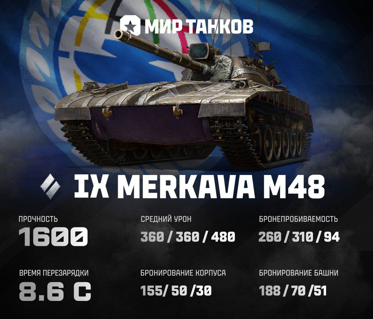 ! Обзор танков из второго сезона Орбиты! Встречайте – средний танк IX уровня Merkava M48, гордость Сборной нации. Этот универсальный боец сочетает в себе мощь и тактическую гибкость. Его главное преимущество – комфортное орудие с превосходными углами вертикальной наводки. Размещенная в корме башня превращает Merkava M48 в мастера засад и неожиданных атак из-за укрытий. Основные характеристики: Прочность:1600 единиц. Броня (корпус): 155/50/30 мм. Броня (башня): 188/70/51 мм. Обзор: 410 метров – видите дальше, действуете быстрее! Удельная мощность: 19,1 л.с./т – достаточно для маневров. Максимальная скорость:49 км/ч вперед / 18 км/ч назад. Перезарядка: 8,6 секунды – готовность к следующему выстрелу. Время сведения:2,3 секунды – цель в прицеле мгновенно. Разброс на 100 м:0,37 м – точность гарантирована. Урон: 360/360/480 единиц. Пробитие: 260/310/94 мм – сокрушительная мощь. Углы вертикальной наводки: -10/20 градусов – играйте от рельефа местности!