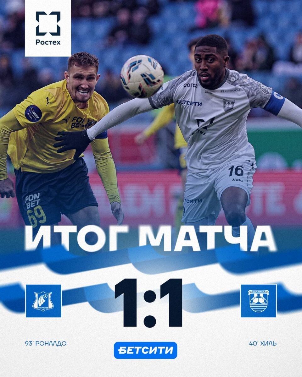 Завершился матч 20-го тура Российской Премьер-Лиги между «Ростовом» и калининградской «Балтикой». Встреча на «Ростов Арене» завершилась ничьей со счётом 1:1. В первом тайме на 39 минуте Хиль открыл счет, забив в ворота «Ростова». Второй тайм оказался насыщенным на события и потребовал от команд максимальной самоотдачи.