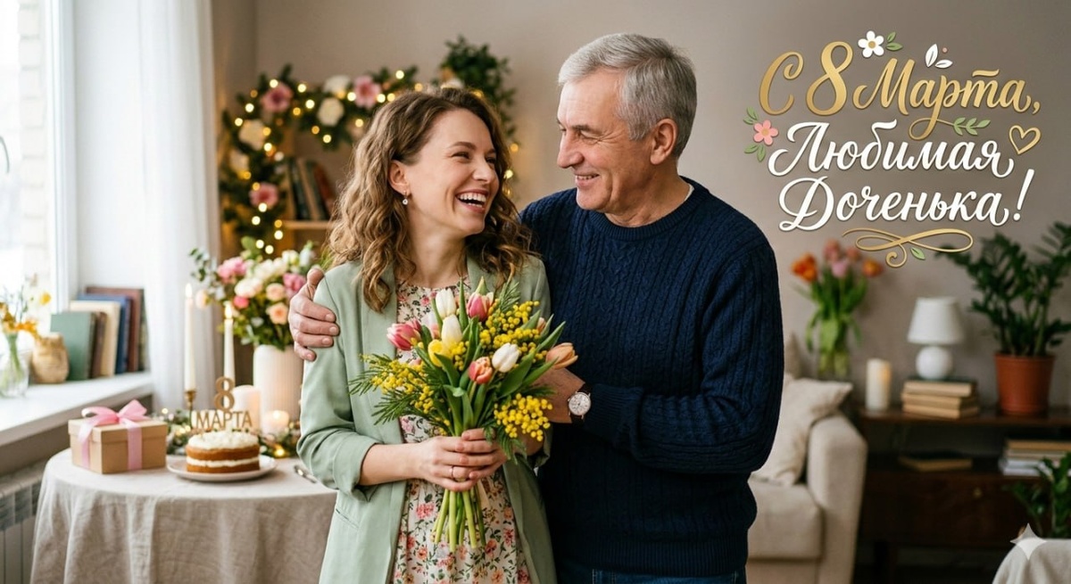 Промт - фотография отца со взрослой дочерью на 8е марта, с праздничной надписью