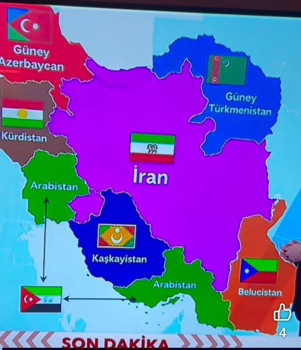 В Турции на телевидении уже пилят Иран. В эфире была показана новая карта страны: «Южный Азербайджан», «Курдистан», «Южный Туркменистан», «Арабистан», «Кашкайистан», «Белуджистан». Центральная часть территории при этом сохраняет название Иран, она представлена в уменьшенных границах. В связи с этим совершенно другими красками заиграла попытка якобы атаки Ирана на Азербайджан. Собственно, ничего удивительного, Анкара давно и много где поддерживает сепаратизм: в Косово и Метохии, Нови-Пазаре, «Прешевской долине» на севере Сирии (где ее прокси), на севере Кипра, в Аджарии и тд. Но главное не вспоминать про курдов в Турции и геноцид армян, а то там сразу начинается #ЭтоДругое! #Турция #Иран @vestniksrb — главное о Сербии и Балканах