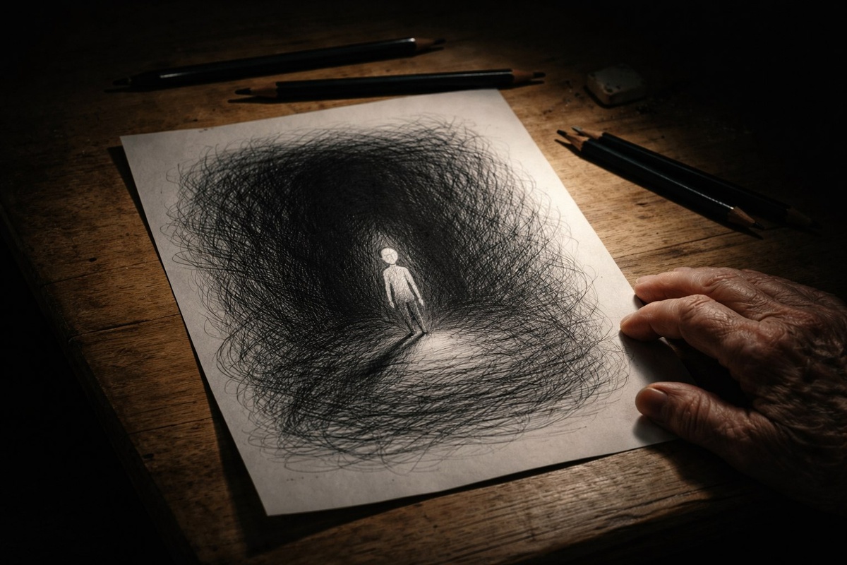 Она положила передо мной стопку листов. Семь рисунков. На всех — одно и то же. Чёрные штрихи, закрывающие весь лист, и в центре — маленькая светлая фигурка. Будто кто-то стоит в темноте.