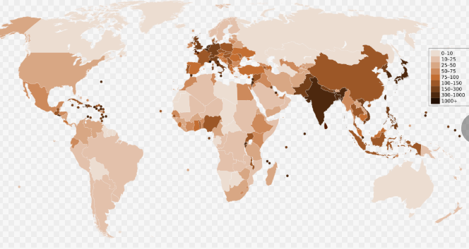 - В Египте средняя плотность составляет около 100 чел/км² (средний показатель для Африки). Но 95% населения Египта живет в долине реки Нил, которая занимает всего 5% площади страны. Там плотность зашкаливает за 2000 чел/км², а вокруг — пустыня, где практически никто не живет.