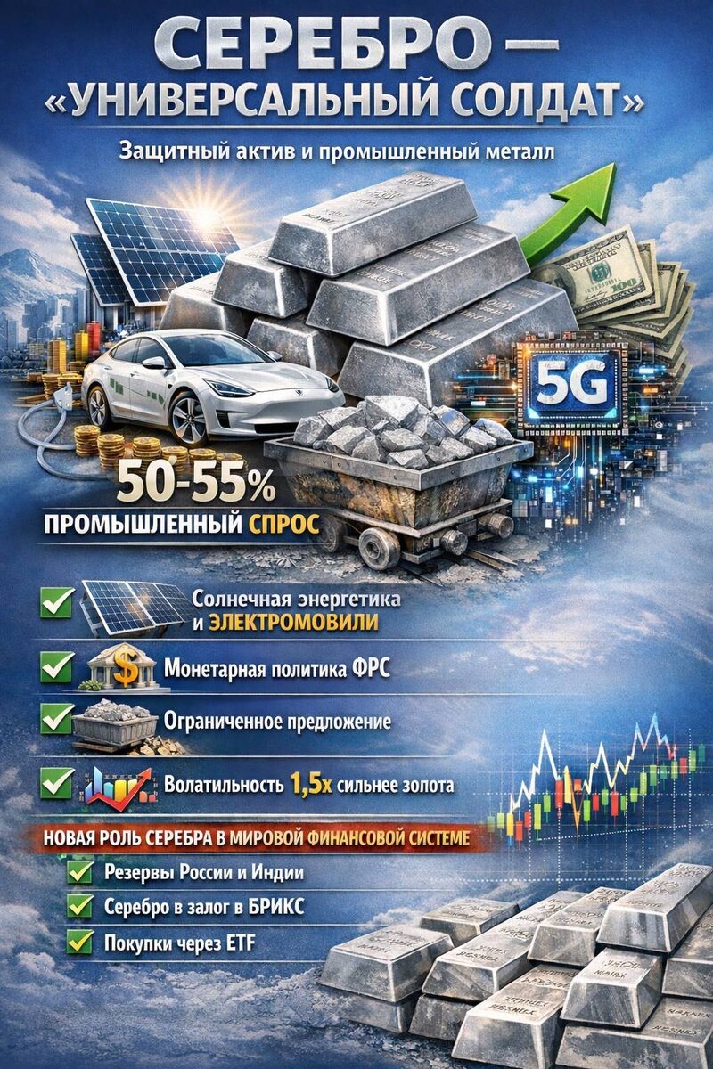 👋Всем привет. Сегодня очень интересная и Важная тема новой рубрики: «От чего зависит стоимость актива?» Ведь понимание факторов ценообразования дает тебе колоссальное преимущество перед теми, кто просто смотрит только на графики. Разберем сегодня с Вами сегодня Серебро. Поехали! 👇 🥈СЕРЕБРО - «УНИВЕРСАЛЬНЫЙ СОЛДАТ» Серебро уникально своей двойственной природой: это и защитный актив, как золото и промышленный металл. КЛЮЧЕВЫЕ ФАКТОРЫ, которые влияют на биржевую цену актива⤵️ ✅Промышленный спрос: 50-55% мирового спроса! Это его главное отличие от золота☝️ Серебро критически важно для: Солнечной энергетики: 200-250 млн унций в год (пятая часть промышленного спроса). Каждый фотоэлектрический модуль требует до 20 г серебра. Производство фотоэлементов в Китае выросло почти на 30% в 2025 году. Электромобилей: они содержат в 2-3 раза больше серебра, чем авто с ДВС. Электроники, 5G/6G, дата-центров, ИИ: спрос растет на 8-12% в год . ✅Монетарная политика ФРС Ожидания снижения ставок традиц