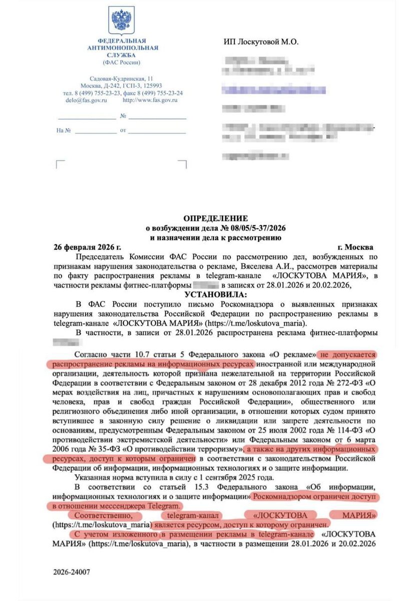 Последние несколько дней вокруг рекламы в Telegram и YouTube в России идёт информационный шум. Попробуем отделить факты от интерпретаций. Что произошло в марте 2026 6 марта Федеральная антимонопольная служба заявила, что размещение рекламы в Telegram и YouTube может считаться нарушением закона о рекламе. Юридическая логика следующая: Россия уже ограничила доступ к этим платформам (замедление, технические ограничения, потенциальная блокировка). А в законе есть норма — нельзя распространять рекламу на информационных ресурсах, доступ к которым ограничен Роскомнадзор. Отсюда вывод ФАС: если доступ к сервису ограничен — реклама там может считаться незаконной. Это новый закон? Нет. Сама поправка действует с сентября 2025 года. Но долгое время её не применяли к Telegram и YouTube, потому что: — Telegram формально не был заблокирован — YouTube только замедляли С начала 2026 года ограничения усилились, и ФАС впервые интерпретировала норму так, что под неё могут попадать и Telegram-кана
