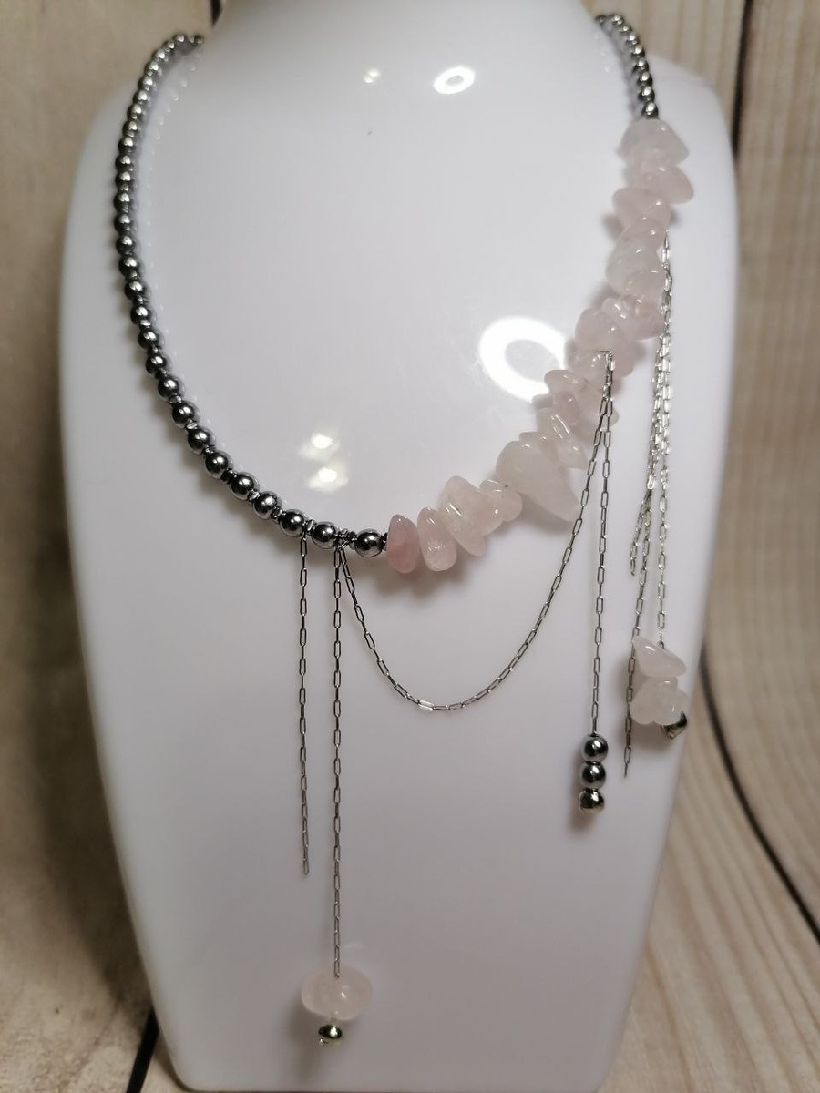 Лаконичный чокер с природными камнями: гематит придаёт строгость, а розовый кварц — лёгкость и воздушность.
