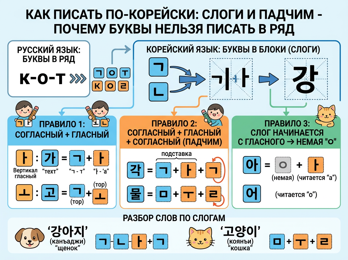 В русском языке мы пишем буквы одну за другой в ряд: к-о-т. Просто и понятно. В корейском так нельзя! Здесь буквы собираются в «квадратики» — слоги. Каждый слог — это маленький блок, внутри которого буквы расположены по строгим правилам. И таких правил всего три. Правило 1: Согласный + гласный