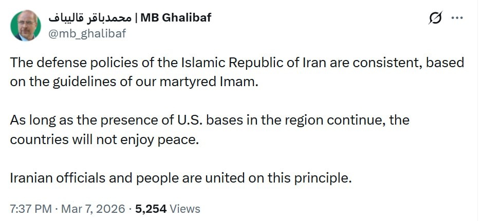 NO PEACE in Middle East as long as US bases remain in the region — Iranian Parliament Speaker Ghalibaf