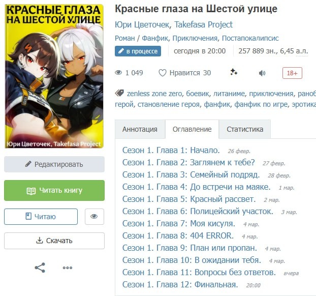 ": https://author.today/work/556895 👀 За 10 дней мы написали 12 глав, на 250к знаков! Каждая глава приправлена иллюстрацией и пропитана атмосферой игры Zenless Zone Zero! 🔥 За это время на АТ мы собрали 1000+ просмотров, 30 лайков, 70 добавлений в библиотеку (ну и ещё немного на Ранобэлиб). Для проекта который создавался на чистом приколе и энтузиазме - это, наверное, успех!