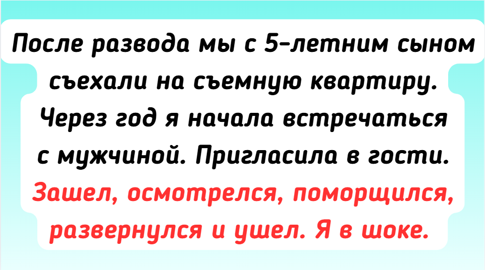 - После развода мы с 5-летним сыном съехали на съемную квартиру. Через год я начала встречаться с мужчиной. Пригласила в гости. Зашел, осмотрелся, поморщился, развернулся и ушел. Я в шоке. И тут вдруг звонок от него: «Так, сфоткай мне патрон у светильника, надо понять, какая лампочка подойдет. И скажи, тебе какой смеситель — с гибкой лейкой или без?» Оказалось, что он, увидев, в каких скромных условиях мы живем, рванул в магазин и купил все, чего не хватало в квартире. Вот тогда-то я и растаяла. Сейчас живем вместе, он все такой же — делает все без лишних слов.