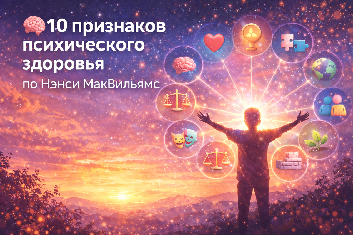 Это не просто отсутствие тревоги или депрессии. Известный психоаналитик Нэнси МакВильямс предложила более глубокий взгляд: психическое здоровье - это способность жить, чувствовать и строить отношения с собой и миром. Нэнси МакВильямс - американский психоаналитик, преподаватель и автор известных книг по психотерапии. Её работы используют психологи и психотерапевты по всему миру, особенно книгу «Психоаналитическая диагностика». Вот 10 признаков психологической зрелости по её подходу: 🙂 1. Способность любить Психически здоровый человек способен строить близкие отношения, доверять, заботиться о другом и принимать заботу. 🧩 2. Способность работать и быть продуктивным Речь не только о профессии. Это способность вкладывать энергию в деятельность, которая имеет смысл. 🪞 3. Реалистичное восприятие себя Человек видит свои сильные и слабые стороны без сильных искажений. Он не идеализирует себя и не обесценивает. 🌍 4. Реалистичное восприятие мира Мир не делится на абсолютно «хороший» и «плохо