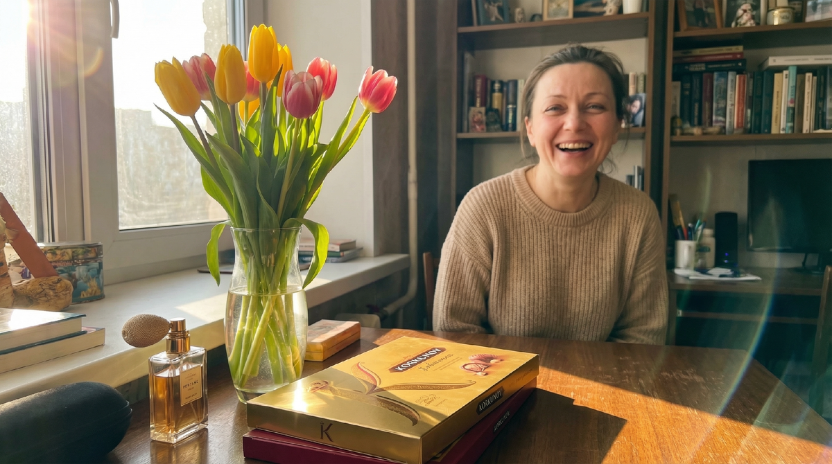 На столе - стандартный "набор выживания" современной женщины: коробка конфет в золоте, охапка тюльпанов и тяжелый флакон духов.