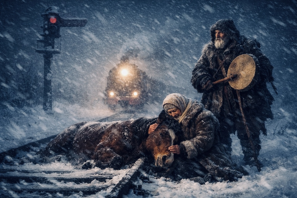 Через десять минут путь был расчищен. Мужичок расстелил на рельсы мешковину, чтобы не скользило. Потом сел рядом с лошадью, ударил в бубен — один раз, глухо, протяжно.