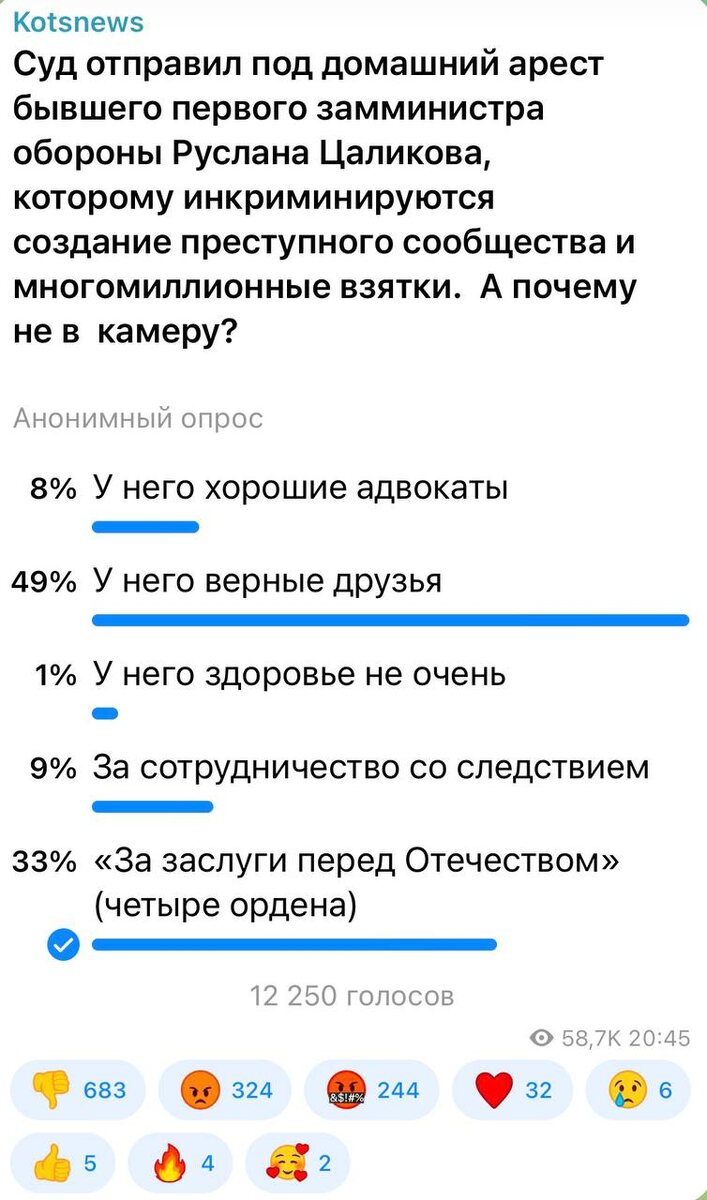 ⚡️⚡️⚡️ 49 процентов подписчиков считают, что Цаликову помогают влиятельные друзья. Узнать бы их пофамильно.
