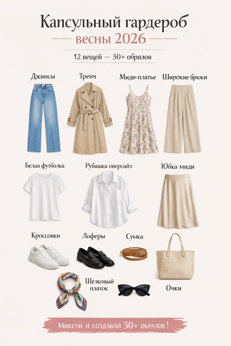 Капсульный гардероб - это набор универсальных вещей, которые легко сочетаются друг с другом. Такой подход помогает: Весной 2026 в моде минимализм, комфорт и мягкие цвета. Поэтому капсула строится вокруг базовых вещей и нескольких трендовых деталей. Ниже - 12 вещей, которые помогут создать десятки образов. Джинсы - основа любого гардероба. Почему они важны: Лучший цвет: синий или светлый деним. Это самая универсальная вещь в капсуле. С чем носить: Весенний тренч - классика, которая никогда не выходит из моды. Почему он нужен: Миди-платье подходит практически всем. Выбирайте простую модель, которую можно носить с разной обувью. Они выглядят элегантнее джинсов. Лучшие ткани: Oversize-рубашка - одна из самых универсальных вещей. Как носить: Юбка делает образы более женственными. Лучшие варианты: Кроссовки - самая практичная обувь. Подходят для: Они делают образ более элегантным. Лучший вариант - нейтральная сумка среднего размера. Маленький аксессуар может полностью изменить образ. Очки до