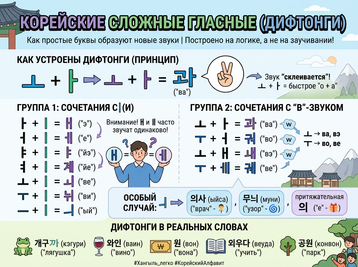 Если вы читали предыдущие статьи, то уже знаете 29 букв из 40 — все согласные и простые гласные. Осталось разобраться с 11 сложными гласными, и алфавит Хангыль покорён! Хорошая новость: их не нужно зубрить — они логично складываются из уже знакомых вам простых гласных. Как устроены дифтонги