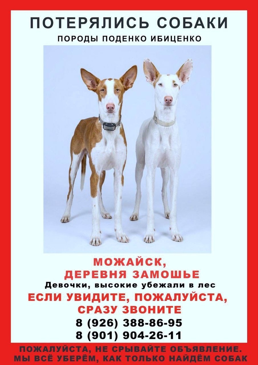 МО, Можайск, дер. Замошье 04.03.26 Потерялись две суки породы Поденко Ибиценко в районе Можайска. Убежали в лес. Собаки не агрессивные, контактные, любопытные, скорее всего вышли куда-то к людям 89263888695 89019042611 https://t.me/HvostatPatrul/216764