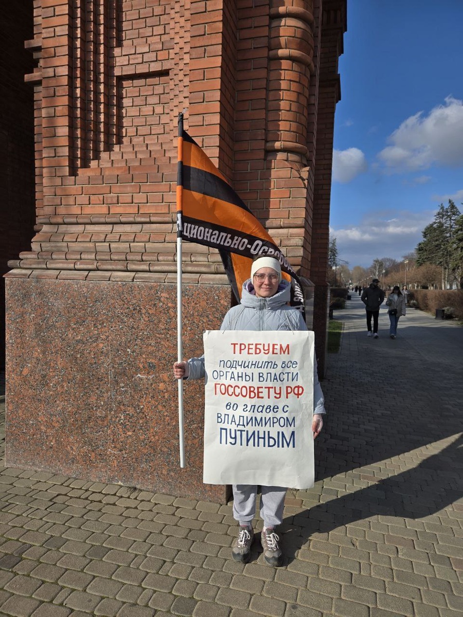 ! "...Для такой страны, как Россия, просто существование нашей страны без суверенитета невозможно, ее просто не будет". В.В. ПУТИН 07.03.2026 активисты Национально-Освободительного движения провели серию одиночных пикетов в центре г. Краснодара, на пересечении улиц Красная и Бабушкина у Александровской арки. Для восстановления суверенитета России необходимы следующие реформы: 1. Отменить самостоятельный статус органов власти, подчинить их Госсовету РФ во главе с Президентом РФ 2. Отменить верховенство международных норм и установить приоритет российского законодательства 3. Учредить Ставку Верховного Главнокомандующего ВС РФ и наделить полномочиями 4. Учредить Госбанк РФ Для осуществления этих реформ нужно изменение Конституции и решение суда об отмене госпереворота 1991 года, вернуть границы Отечества. Принять участие в обращениях в органы власти с этими требованиями можно на сайтах: Горбсуд.рф Gorbsud.ru Путин-наш-лидер.рф