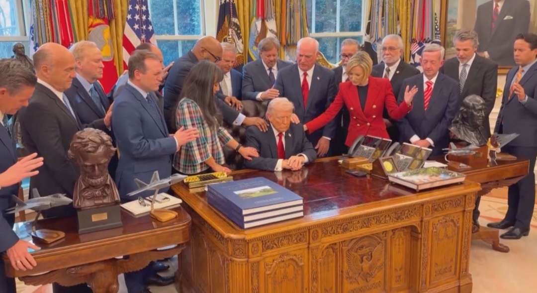Заместитель главы администрации Белого дома Дэн Скавино поделился видео, которое быстро стало вирусным, на котором президент США Дональд Трамп сидит в Овальном кабинете Белого дома, а евангелические религиозные лидеры молятся за него.