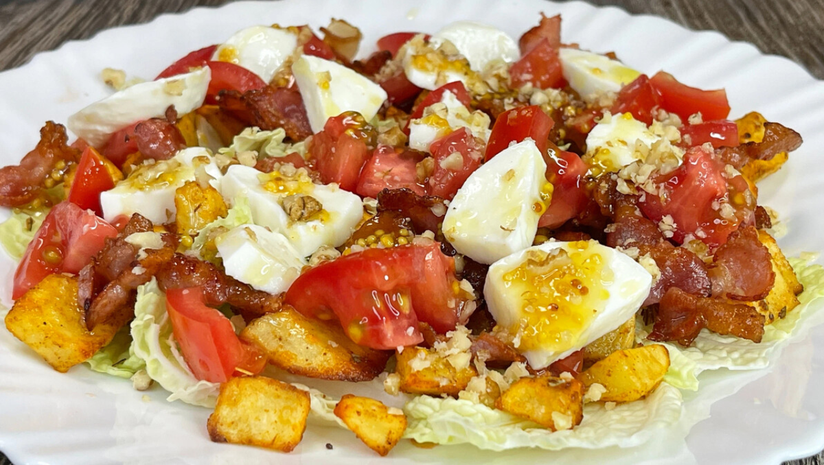 Иногда самые вкусные блюда получаются из самых простых продуктов. Этот салат — именно такой вариант. Он готовится легко, выглядит аппетитно и отлично подходит как для семейного ужина, так и для праздничного стола. Я часто готовлю его к приходу гостей, и каждый раз кто-то обязательно просит рецепт. Секрет этого салата — в сочетании свежих овощей, нежной моцареллы и слегка подрумяненного картофеля. А простая медово-горчичная заправка объединяет все ингредиенты и делает вкус особенно ярким. Такой салат получается лёгким, но в то же время сытным. Он хорошо подходит как самостоятельное блюдо или как гарнир к мясу и рыбе. Для приготовления салата понадобится: 1. Подготовим основу салата Пекинскую капусту можно нарезать крупными кусочками или просто нарвать руками. Так она будет выглядеть более воздушной и сохранит сочность. Выложите капусту на дно салатницы — она станет лёгкой и свежей основой блюда. 2. Нарезаем овощи и сыр Моцареллу нарежьте крупными кусочками. Помидор также нарежьте про