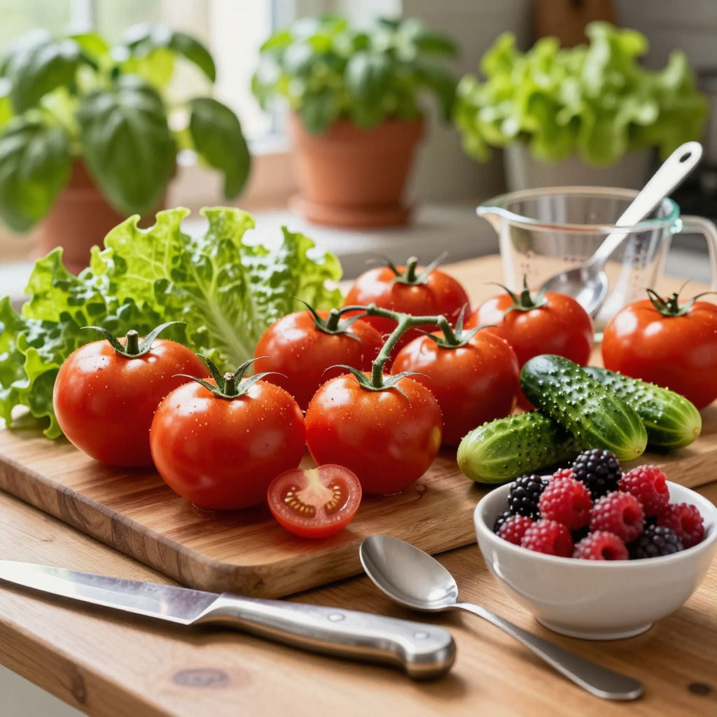 1. Салат «Летний микс» Ингредиенты: * помидоры — 3–4 шт.; * огурцы — 2–3 шт.; * редис — 5–6 шт.; * зелёный лук — 3–4 пера; * укроп и петрушка — по несколько веточек; * оливковое масло — 2 ст. л.; * соль, перец — по вкусу. Приготовление: 1. Помидоры и огурцы нарежьте крупными дольками. 2. Редис нарежьте тонкими кружочками. 3. Мелко порубите зелень и зелёный лук. 4. Смешайте все ингредиенты в большой миске. 5. Посолите, поперчите, заправьте оливковым маслом и аккуратно перемешайте. 2. Овощное рагу с кабачками и баклажанами Ингредиенты: * кабачки молодые — 2 шт.; * баклажаны — 1–2 шт.; * болгарский перец — 2 шт.; * помидоры — 3 шт.; * лук репчатый — 1 шт.; * чеснок — 2–3 зубчика; * растительное масло — 3 ст. л.; * зелень (укроп, петрушка) — для подачи; * соль, специи — по вкусу. Приготовление: 1. Лук и чеснок мелко нарежьте, обжарьте до золотистого цвета. 2. Баклажаны нарежьте кубиками, посолите и оставьте на 15 минут, затем промойте и отожмите. Добавьте к луку. 3. Кабачки и перец нарежь