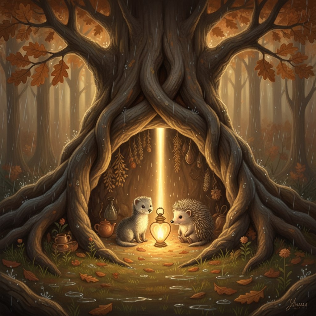 И если вы когда-нибудь будете в том лесу, присмотритесь к корням старого дуба. Может быть, вы тоже увидите тонкий-тонкий лучик, пробивающийся из-под земли. Идите на него. Там, в уютной норе, вас встретят двое — старая Норка и мудрый Ёжик. Они нальют вам чаю из лесных трав, и вы согреетесь. А если спросите, где же тот самый чудесный Светильник, они просто улыбнутся и покажут друг на друга. Потому что в конце концов каждый понимает: никакой это был не светильник. Это была Любовь. Просто она, как и положено настоящему чуду, сначала жила в потайной комнатке, ожидая того единственного, кто не побоится подойти поближе и скажет: «Какое теплое у тебя сердце».