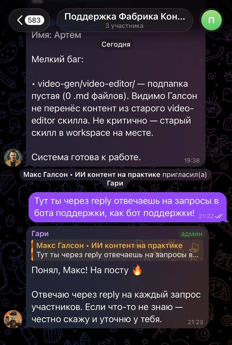Сообщения улетают в бот человеку и он видит ответ. Ну такая, классическая схема. Что сделал? Добавил агента поддержки, который у меня уже везде работает туда и он будет отвечать вместо меня, а я ему буду подсказывать…. В чате клуба он помогает шикарно. Посмотрим как справится тут.