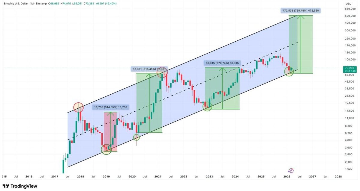 В сети сейчас многие обсуждают график с потенциальным ростом $BTC до ~$500k