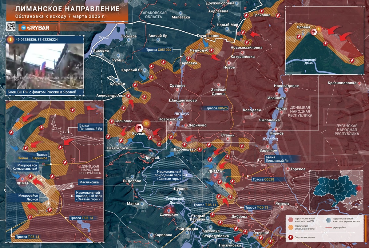 На Лиманском направлении продолжаются весьма активные бои. Российские подразделения атакуют в лесах к северу от Святогорска. Локальные успехи есть на рубеже Сосновое — Александровка, несмотря на попытки контратак украинских формирований. На окраинах самого Святогорска продолжаются бои. Российским подразделениям удалось закрепиться в восточной части Яровой, и противник теперь пытается выбить оттуда в ВС РФ, атакуя через леса со стороны как раз Святогорска. Идут тяжелые бои. Встречные столкновения продолжаются и в Дробышево, а вот восточнее, со стороны Ставков, российские штурмовики прорубают путь через овраг к северным окраинам Лимана. На восточных и южных окраинах города тем временем продолжаются встречные бои малых групп. Полноценного контроля здесь достигнуть никому не удается, в силу высокой активности дронов. По мере наступления весны лесные участки становятся все сложнее проходимыми и действуют это для обеих сторон. Российские подразделения систематически наносят удары дронами и а
