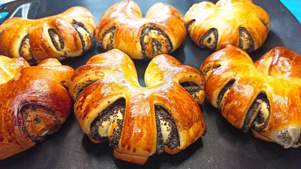 Булочки Рогалики получаются воздушные и очень вкусные! Выход 12 булочек. Тесто получается сдобное, мягкое, воздушное, долго не черствеет. Выход ≈ 12 штук среднего размера. Для сдобного теста: - Молоко — 150 мл (тёплое, ≈35–38 °C) - Свежие дрожжи — 20 г **или** сухие дрожжи — 6–7 г - Сахар — 100 г - Соль — ½ ч. л. - Ванильный сахар — 8–10 г (или 1 ч. л. ванильного экстракта) - Яйца — 2 шт. (среднего размера, ≈55–60 г каждое) - Мука пшеничная — 480–520 г (высший сорт, ≈3⅓–3½ стакана объёмом 250 мл) - Сливочное масло — 70 г (мягкое или растопленное, но не горячее) Для маковой начинки (выход ≈400 г): - Пищевой мак — 150 г - Сахар — 150 г - Вода **или** молоко — 150 мл - Сливочное масло — 30–40 г - Ванилин или ванильный сахар — по вкусу (≈1 ч. л.) Для смазывания перед выпечкой: - Желток — 1 шт. - Молоко — 1 ст. л. Дополнительно: немного муки для подсыпки, растительное масло для смазывания миски. 1. Готовим маковую начинку (можно сделать заранее) - Мак хорошо промойте в холодной воде 2–3 ра
