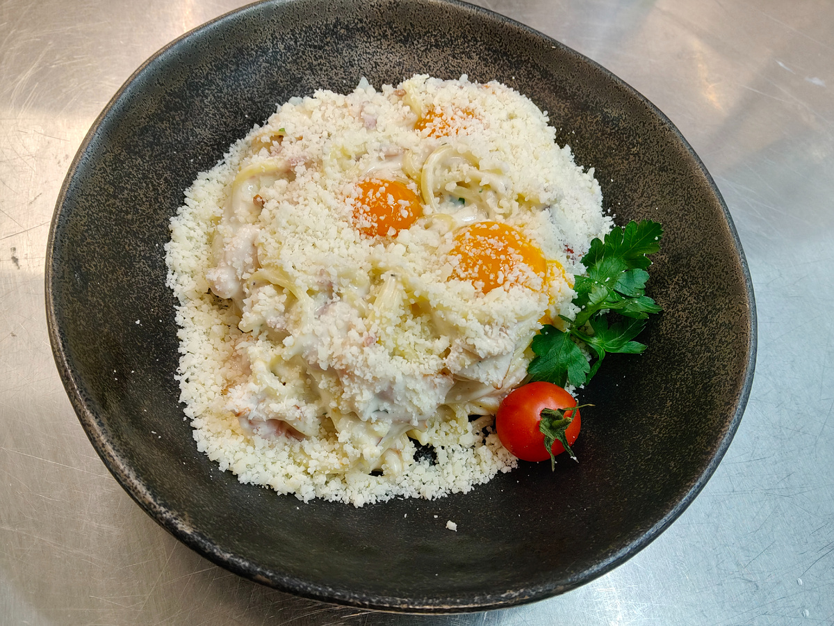 - Боязнь яиц. Классическая карбонара требует виртуозной техники, чтобы яйца превратились в крем, но не свернулись. В российских реалиях, где пасту часто варили «про запас» или разогревали, риск получить омлет с макаронами был слишком велик. Сливки стали гениальным решением: соус гарантированно получался густым и вкусным, даже если паста немного остыла.
