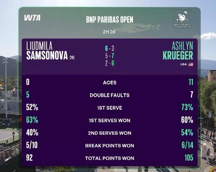 ⚡ WTA 1000 Indian Wells R2: A. Krueger def. [19] L. Samsonova 3-6, 7-5, 6-2